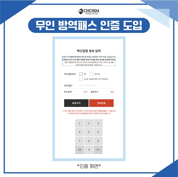 초심스터디카페는 매장 이용 시 반드시 거쳐야 하는 키오스크 및 애플리케이션에서 고객이 직접 백신 접종 정보 입력 후 매장을 이용할 수 있는 시스템을 적용했다고 밝혔다. 무인 시스템 협력사인 코보시스와 함께 자체적인 개발을 진행, 10일 금요일에 해당 시스템 업데이트하고 13일 월요일 0시부터 초심스터디카페 전 지점에 적용된다.